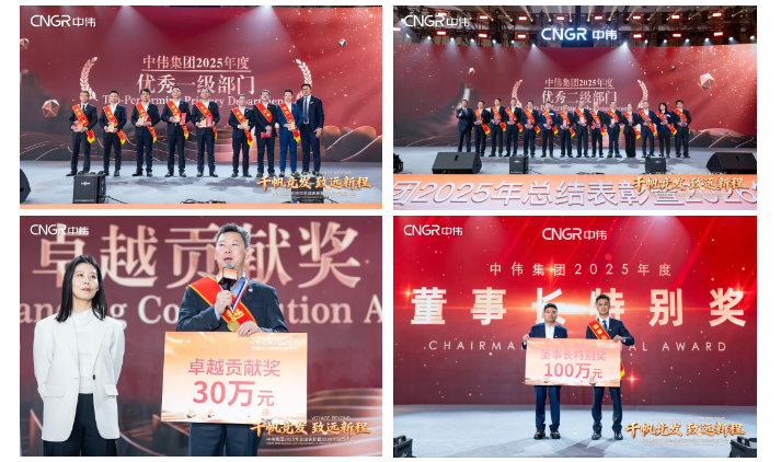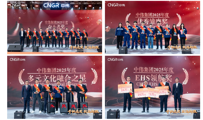 2025年,中伟集团各板块、各部门保持高水平战略执行力,组织能力与人才水平实现双重跃升,在技术创新、经营服务、效能突破等领域涌现出众多标杆典范,为企业高质量发展注入强劲动能。在大会颁奖环节,对年度“奋斗者”“优秀雏鹰”“多元文化融合之星”以及“EHS 领航” 优秀一级、二级部门等先进个人与团体进行了集中表彰。凭借卓越业绩与特别贡献,几位核心管理者斩获重要荣誉:中伟新材印尼大区副总裁符培文、中伟新铂总经理潘再富带领团队攻坚集团硬仗,破局突围、战果累累,荣获集团 “卓越贡献奖”;中伟新材副总裁李成率领经营团队扎根业务一线、实现经营销售逆势攀升,为公司营收利润增长立下汗马功劳,获颁集团特设的 “董事长特别奖”。